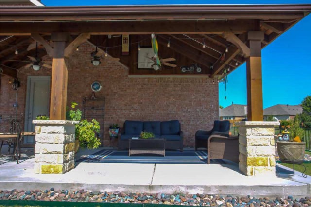 This custom patio cover walkway project in Argyle, Texas blends shade, structure, and natural design flow. It features a durable patio cover connected by a flagstone concrete path that guides guests through the backyard with both style and function. Built by trusted outdoor living contractors in Dallas Fort Worth, this space showcases craftsmanship that enhances comfort and curb appeal for everyday use.